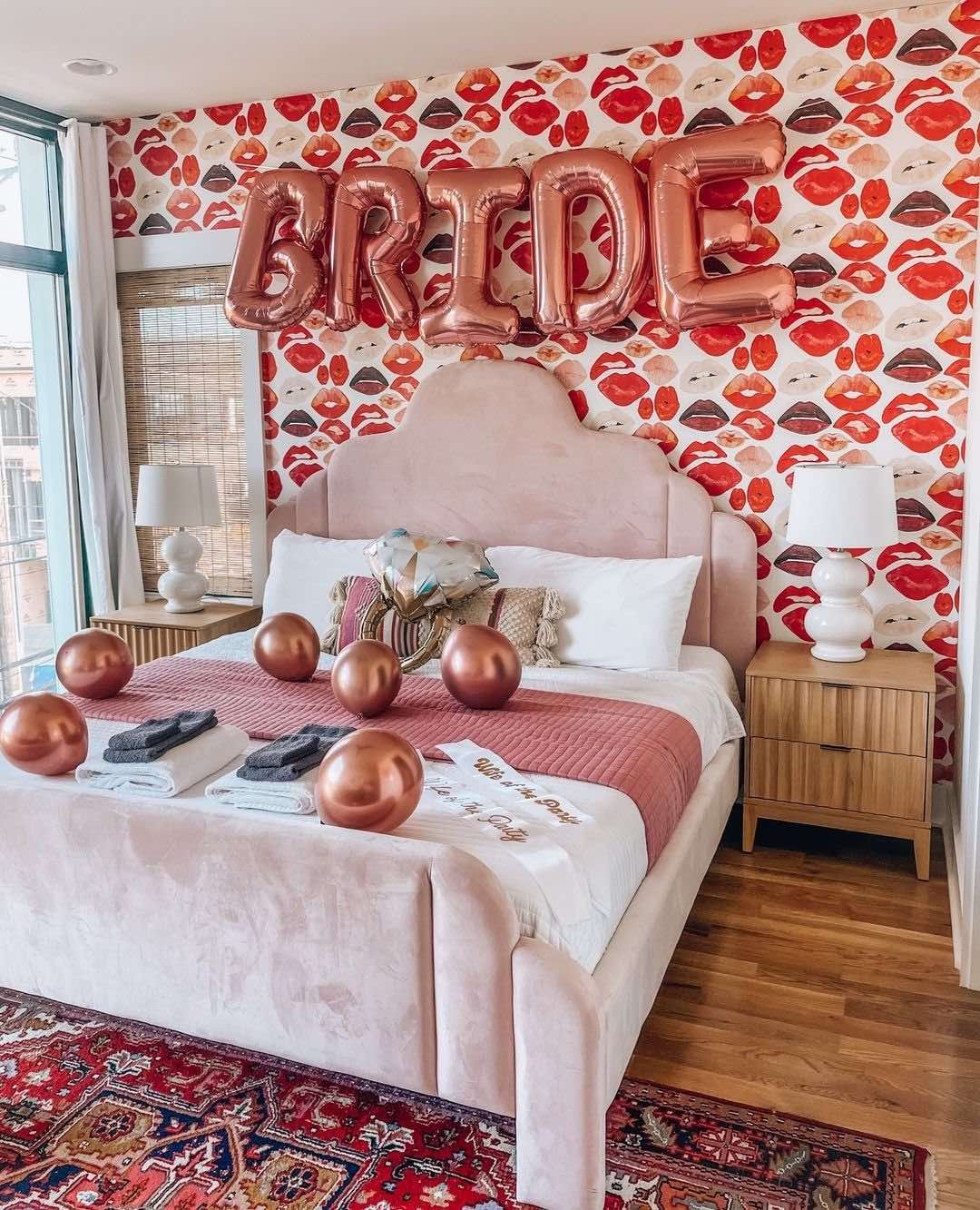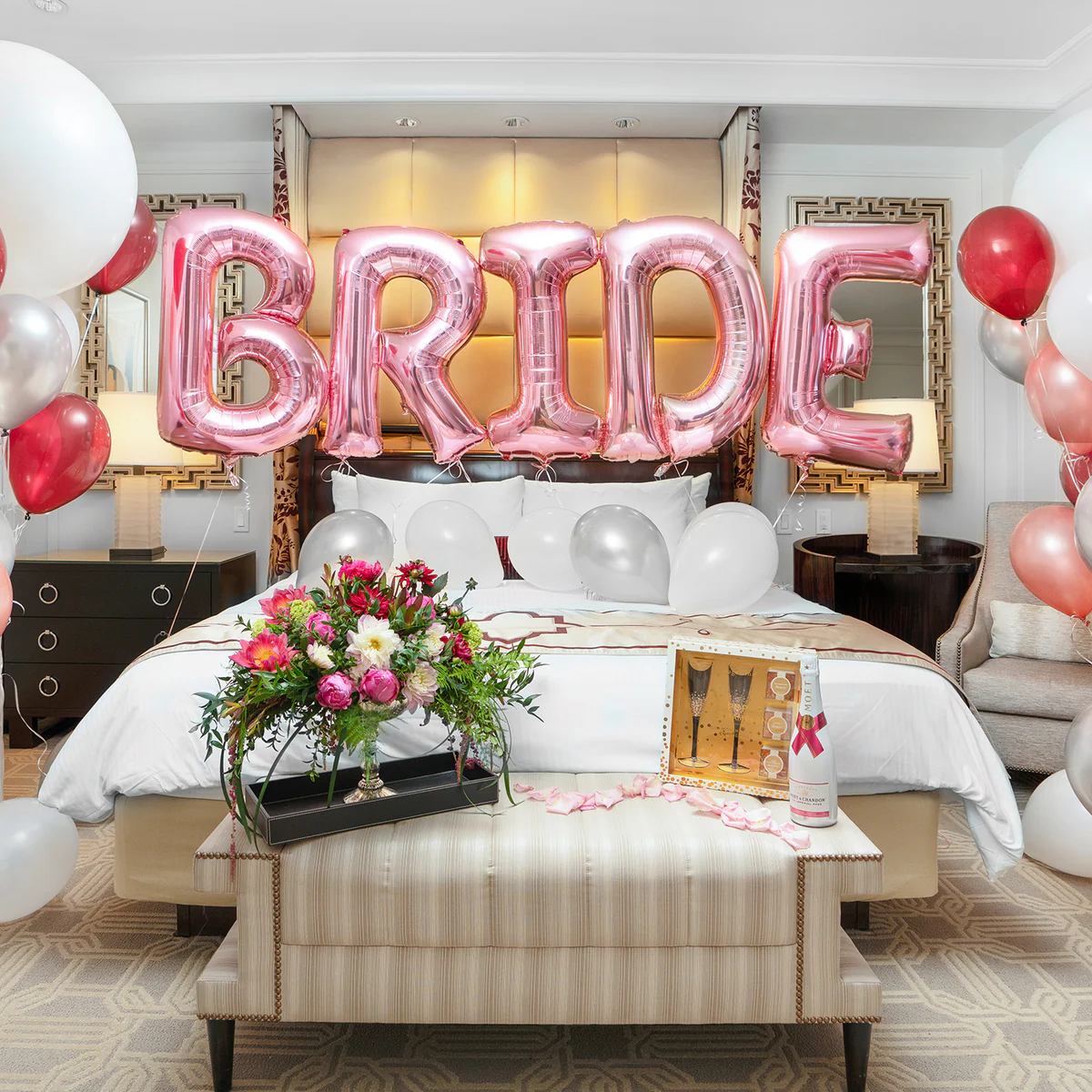 - Cozy room decor with LED lights, balloon ceilings, rose petals, and dreamy bed setups