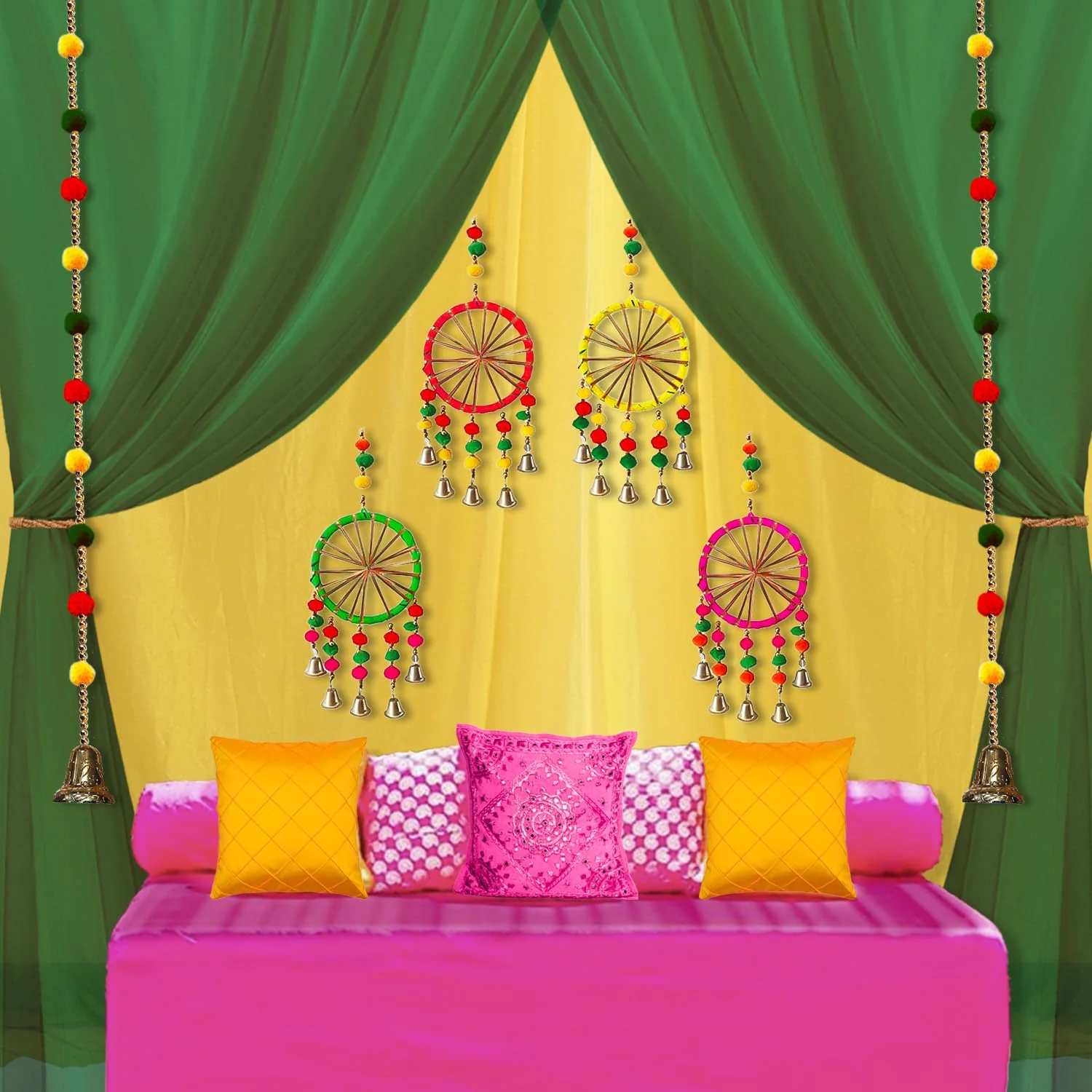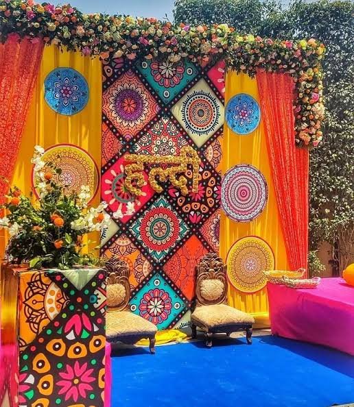 Vibrant drapes in rich colors like orange, pink, and green, paired with personalized backdrops that add flair to your Mehndi setup.