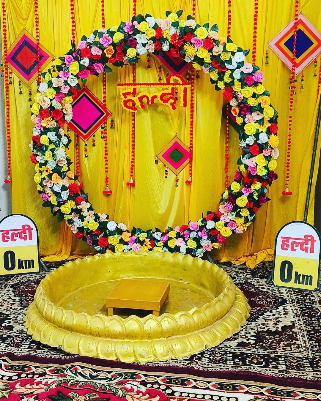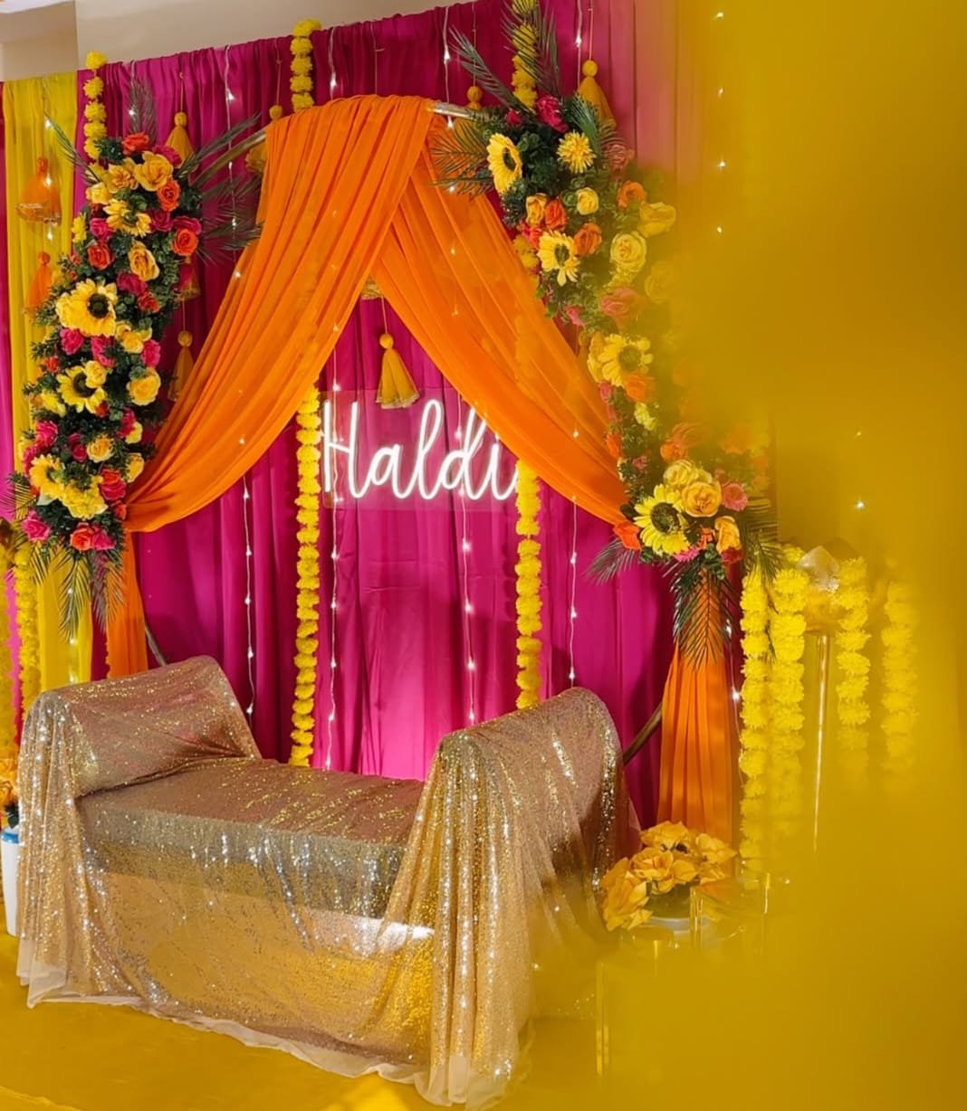 Since yellow is the color of Haldi, we use marigold flowers, yellow drapes, cushions, and rugs to create an inviting atmosphere.