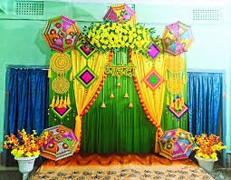Incorporating flowers like jasmine, marigold, and roses, along with props like painted umbrellas, colorful cushions, and traditional lanterns.