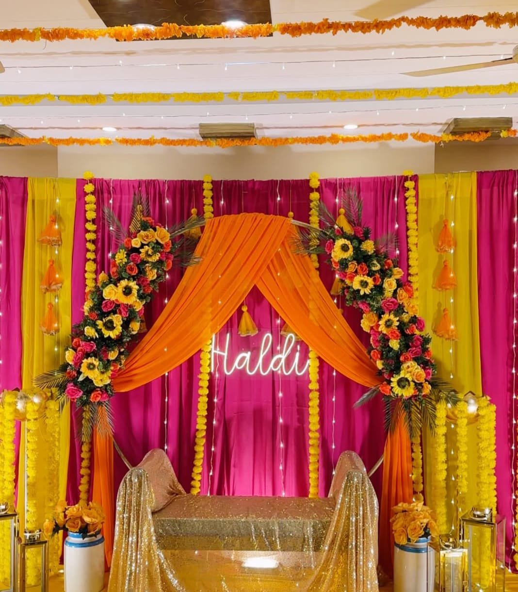 Whether it’s a grand Mehndi function or an intimate Haldi ceremony, we provide a wide range of decor solutions that capture the essence of tradition and modern aesthetics. From colorful floral arrangements to traditional fabric drapes, we ensure your event looks beautiful and vibrant, setting the perfect mood for a day full of laughter, rituals, and memories.